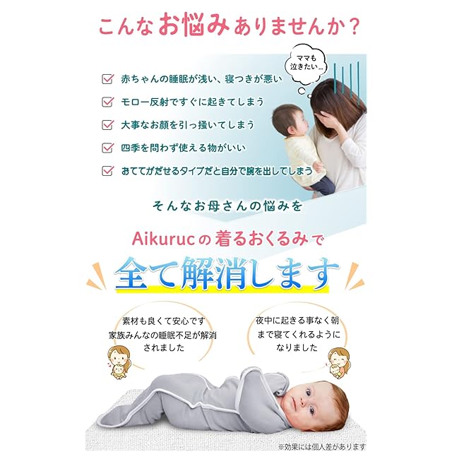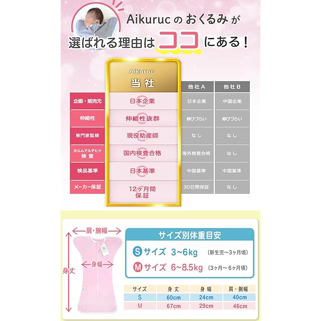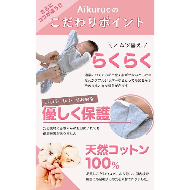 【 類似品にご注意ください 】本製品は赤ちゃんの股関節や肩の脱臼のリスクを抑えるため、またオールシーズン着用できる様に、生地を薄めにして通気性、伸縮性抜群の素材になっております。生地が厚く伸縮性の低いおくるみは脱臼の危険性があります。また、サイズ表に合ったサイズ選びにご注意ください。サイズ表をしっかり確認した上でもサイズが合わない場合は、カスタマーサポートにてお問い合わせ下さい。