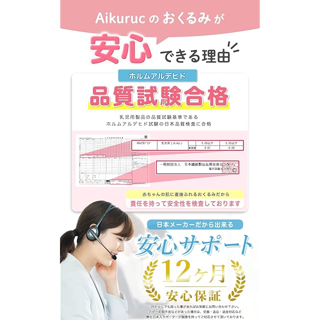 【天然コットン100%】天然コットン100%の素材で出来ており、ホルムアルデヒド国内試験にも合格済み。蛍光剤と漂白剤などの有毒な染料が一切ありませんので、赤ちゃんの肌に直接触れたり、赤ちゃんがお口に入れても健康被害がありません。