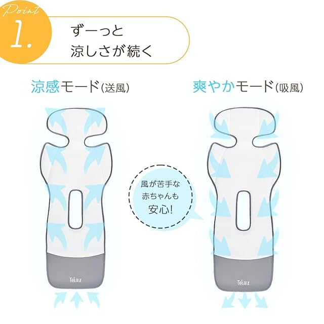 【送風&吸風のW冷却モード】送風モードでひんやり風を送り、吸風モードでこもった熱や湿気をしっかり排出。汗をかいてもさらさら快適で、汗っかきな赤ちゃんもごきげん。赤ちゃんのためのW冷却設計で、暑い日のベビーカーやチャイルドシートでも安心です。