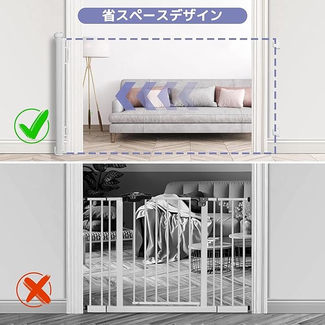 ❀❀様々なドア幅に対応:この100cm以上ロール式ベビーゲートは、使用しない時の収納に便利で場所を取りません。巻き取り式のデザインは、あらゆるサイズのドアフレーム(幅140CMまで)にフィットするので、ベビーエンクロージャーのサイズが合わないという心配はありません。フック接続とメッシュゲートのデザインにより、片手でメッシュゲートを開けることができます。赤ちゃんや幼児、猫や犬などの小さなペットがいるご家庭には、ベビーゲートがおすすめです。