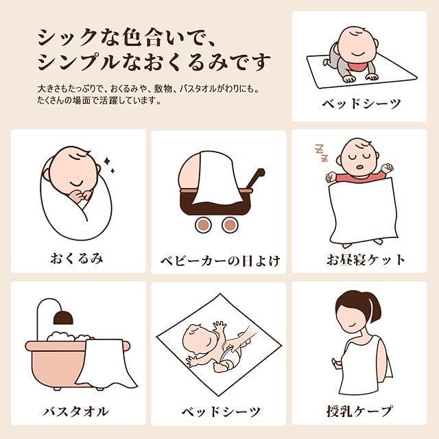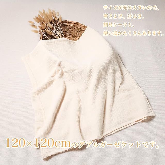 100%綿! おくるみガーゼは、赤ちゃんを優しく包み込むために設計された、綿100%のダブルガーゼ素材を使用したおくるみです。