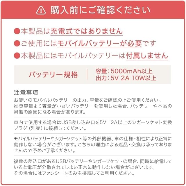 【注意事項2】●モバイルバッテリーやシガーソケット等の外部機器、車の仕様・相性により正常に動作しない場合がございます。 こちらの理由による返品・交換は承っておりませんので予めご了承ください。●複数の差込口があるUSBバッテリーやシガーソケットの場合、同時に給電していると電圧が分散されてしまい正常に動作しない場合がございます。その場合にはファンシートのみを接続してご利用ください。●車内で使用する際は必ず車内の温度を適正温度にまで下げてからご使用ください。●使用する際は、必ず保護者の目の届く場所で使用してください。●長時間継続して使用すると健康を害することがあります。保護者が常に注意を払い適切に使用してください。●ファンは水濡れ厳禁です。ファンに液体が入ると故障の原因になります。