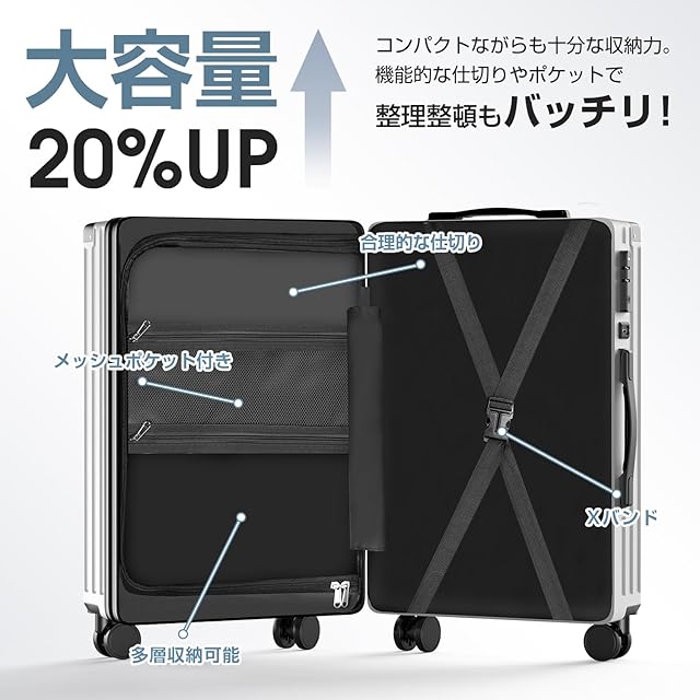 【市場最軽量・超大容量】市場最軽量仕様として、一般的なスーツケースより、平均1kg重さが遠います。長時間スーツケースをもって移動する場合や頻繫に出張、旅行の方におすすめです。Sサイズ、機内持ち込みにも最適です。さらに、メッシュポケット内蔵され合計4箇所メイン収納があります。大容量収納×合理的なデザイン、コンパクトながらも十分な収納力があります!機能的な仕切りやポケットで整理整頓もバッチリ!大容量なスーツケースは収納便利、旅行や故郷帰りなど最適なスーツケースです。