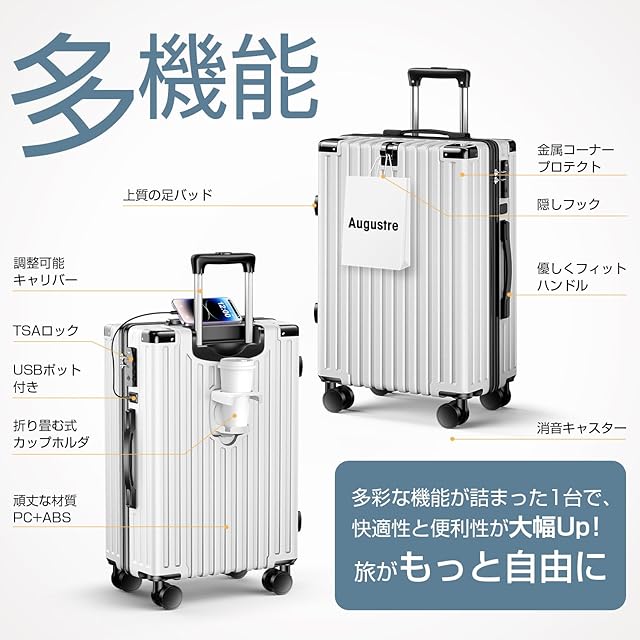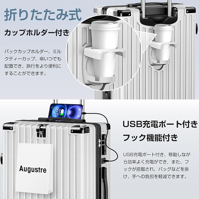 【2025新モデル・多機能な1台】2025年に業界高品質スーツケースが新登場!隠しフックとUSBポット付きで、スマートフォンやタブレットなどのデバイスを充電することができます、外出先でバッグや小物を掛けるのに便利です!。折り畳み式のカップホルダーもいつでも水やコーヒーカップ、または他の飲み物容器を置くことができます。また、欧米基準のTSAロックも装備され、海外旅行にもピッタリ、より便利な旅行へ。