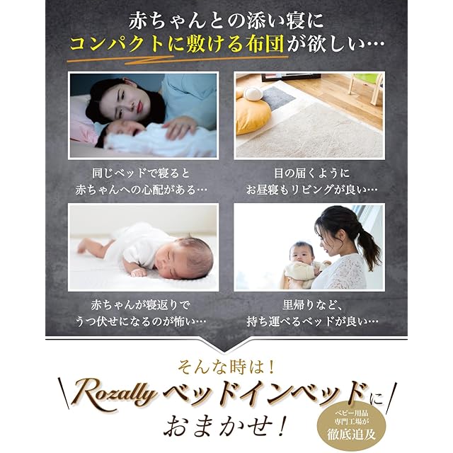 【保育士が監修】 Rozally ベッドインベッド がついに正式販売開始。 赤ちゃん と 添い寝 をする時に 寝返り防止 機能がある ベッドインベッド が欲しい…というお客様の声から生まれた 持ち運び 可能なベットインベットです。 乳幼児 がリビングなどママさんの目の届く所で寝れるように “折りたたみ コンパクト”&”軽量”の 持ち運び設計で企画させて頂きました。 企画&設計では 新生児 や ベビー の育児に詳しい【保育士】の先生からアドバイスをもらい、 折り畳み 方法 や 転落防止 など色々な使用方法を説明書として添えて企画&開発しました。衛生面にも配慮して、通気性 がよく 洗濯可能 なモデルになっています。