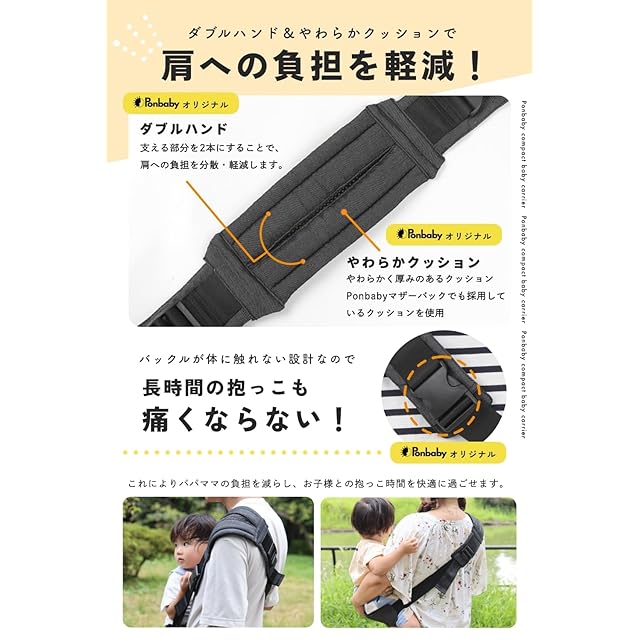 【ダブルハンド&やわらかクッション】ダブルハンド&やわらかクッションで肩への負担を軽減!Ponbabyマザーバックでも採用しているクッションを使用!ダブルハンド部分が大きく広がるので、肩への負担を軽減します。さらにやわらかクッションがやさしく肩を包みます。また中央部分にはメッシュ素材も使用しているので、熱がこもらずさわやかに使用できます。