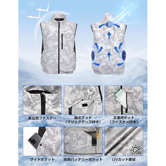 【冷感素材を厳選して織りあげ】ポリエステル100%素材で作られており、吸湿性と速乾性に優れています。冷却服の生地はとても薄いので、冷却ファンをつけると作業着がふわっと膨らみ、肌に直接触れないようになり、気流が空調冷却服の内部に流通します。高密度の氷糸繊維が冷却ベストの表層からの空気の滲み出るを抑え、エアコンのファンで発生する突風を最大限に活用することができます。空調作業服の表層にはUVカット加工が施されており、有害な光を遮断し、強い日差しからお肌を守ってくれます。