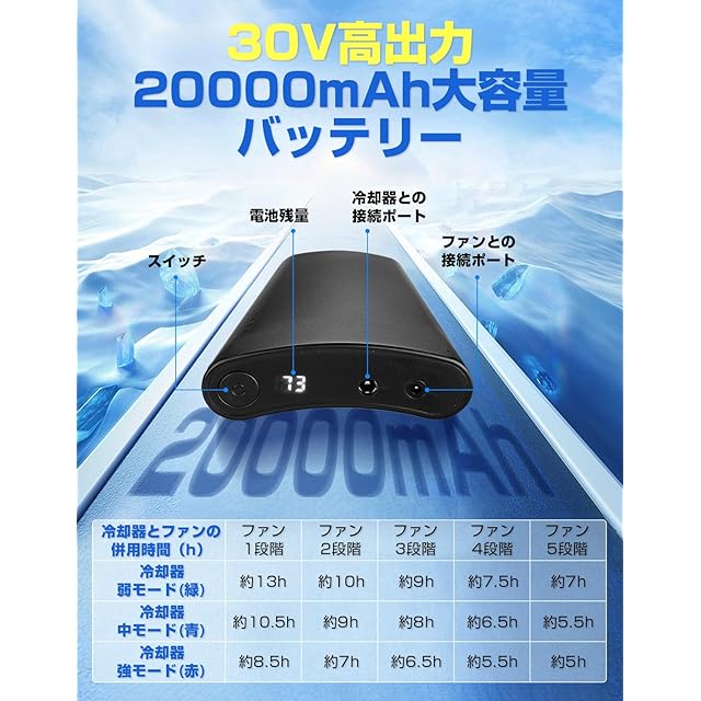 【一日中使えるバッテリー】4時間の急速充電対応、急速出力対応の最新モデル、30V高出力パワーバッテリーセット登場!冷却器とファンだけでなく、スマホも問題なく充電できます。20000mAhの超大容量で、最大13時間で冷却器とファンの併用ができ、1日中かかる作業のニーズに十分応えることができます。もっと重くて大きい電池を買う必要は全くありません!バッテリーには段階表示ライトが搭載されており、操作は非常にシンプルかつ直感的です。