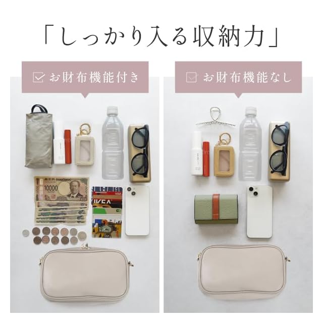 【2タイプ共通】「しっかり入る収納力」よく持ち歩く必需品、ペットボトルなどが入りました!「ショルダーベルト2本付」\両方とも長さ調整OK!/大人だけのお出かけには、上品な細ベルトを。カジュアルにはトレンドの太ベルトと、使い分けていただけます。