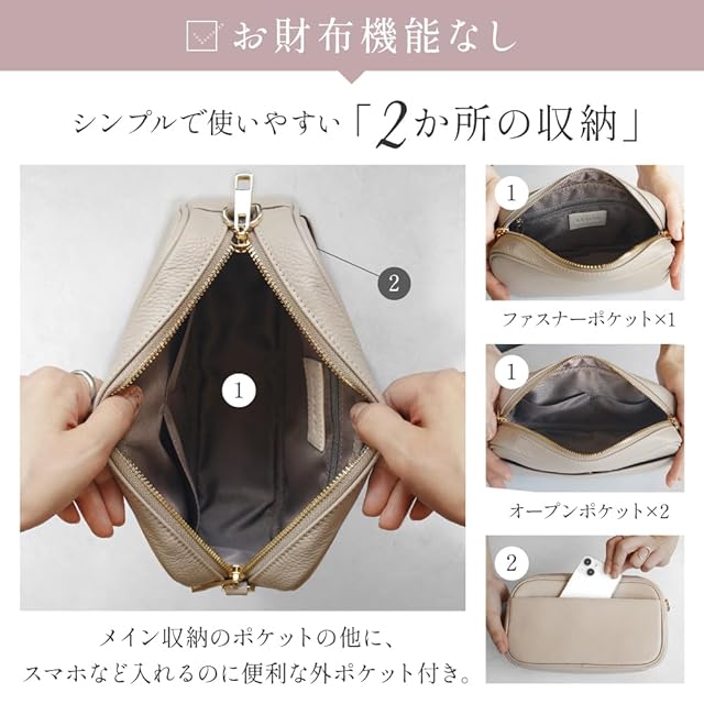 【お財布機能なし】「シンプルで使いやすい2か所の収納」(1)メイン収納 (2) スマホなどが入る外ポケット の2か所に分かれています。バッグの中にもファスナーポケット、オープンポケット×2があります。