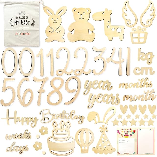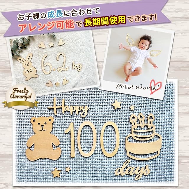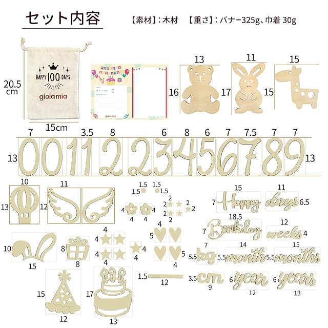 【オリジナルモチーフ】gioia miaオリジナルのうさぎ、くま、きりんがセットに入っていてお子様の関心を惹きつけます。また、数字や文字のバリエーションも豊富です。スラッシュは1/2バースデーなどに。cm、kg 、小数点は、成長記録にお使いいただけます。 【セット内容】合計52枚、0,0,1,1,2,2,3,4,5,6,7,8,9、Happy, Birthday、days、weeks、month(s)、year(s)、kg、cm、ー、ケーキ、プレゼント、つばさ*2個、うさぎのみみ、パーティー帽子、気球、うさぎ、くま、きりん、ハート*4、ほし(大)*5、ほし(小)*5、花*2、ドット*2のデラックスセット。収納袋付きでスッキリまとめることができます。 メッセージカードは、おめでとうのお祝いの気持ちを伝えるのに最適です。 【お試しgioia mia リトミックスカーフ付き】当店人気商品のリトミックスカーフ1枚プレゼント!カラフルカラーとふわふわ触感がお子様の五感を育てます。いないいないばあや見立て遊びにも。赤ちゃんから長く遊べます。 【幅広い用途】イベントに合わせてご自由に組み合わせることができます。お食い初め、お宮参り、100日記念、1歳の誕生日、ハーフバースデー、ファーストバースデー、マタニティフォトにおすすめです。子供だけではなく、大人も是非ご利用ください。銀婚式や金婚式など結婚記念日や、還暦祝いなどにもお使いしていただくことができます。また、ギフトとして、赤ちゃんの出産祝いなどの贈り物にもピッタリです。 【素材】赤ちゃんに優しい天然木で作られ、塗料・染料など一切使用されておりません。木を使用しているため、製品によって木目や色にばらつきがございます。また、材質の特性上、切断による焼け・トゲ・ささくれなどがまれに発生する場合がありますのでご注意ください。セットには小さなパーツが含まれますので、お子様などが誤って口に含まないよう充分にご注意ください。