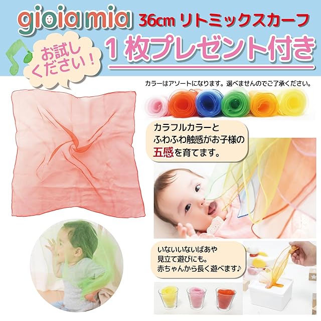 【お試しgioia mia リトミックスカーフ付き】当店人気商品のリトミックスカーフ1枚プレゼント!カラフルカラーとふわふわ触感がお子様の五感を育てます。いないいないばあや見立て遊びにも。赤ちゃんから長く遊べます。