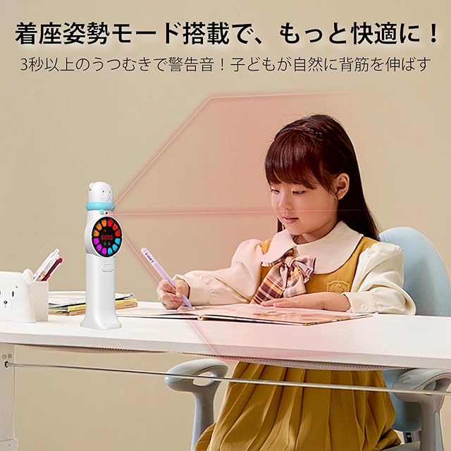 【操作説明】 ①左:タイマーモード 右:着座姿勢モード 右側:測定モード ご注意:いずれかのボタンを押しすると、本体がスタートします ②左:タイマーモード設定範囲は5~60分間以内 ③右:着座姿勢モード お子様の約0.5m前に置き、着座姿勢モードを起動させる(タイマーモードと併用可能) 子供が悪着座姿態の場合は、 「ピッピッ音」でお知らせで、今正しい着座姿勢を維持必要します。
