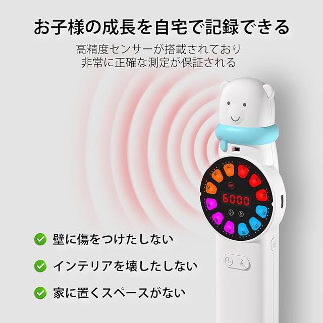 【可愛らしいキャラクターデザイン】 赤外線技術を採用しており、超音波や手動での測定と比較して誤差が少なくで 身長は液晶にわかりやすく表示。コンパクトで収納にも困らないので今の所便利です。