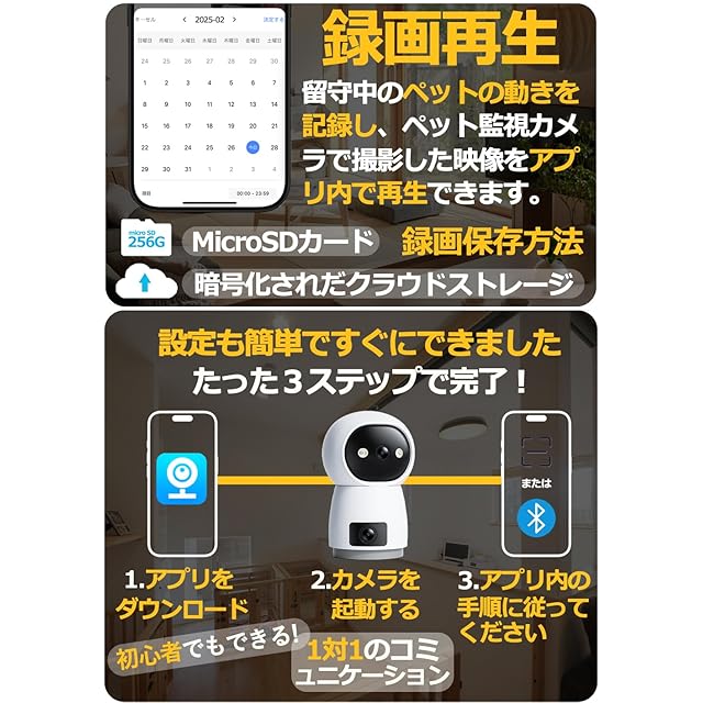 【24時間録画・ビデオ再生・自動保存】24時間全日録画、自動保存。録画した動画はいつでもアプリで再生できます。microSDカードに保存可能(256Gまでサポート)、最大30日間のビデオ再生に対応。暗号化されだクラウドストレージ、ビデオの保存時間は無制限。