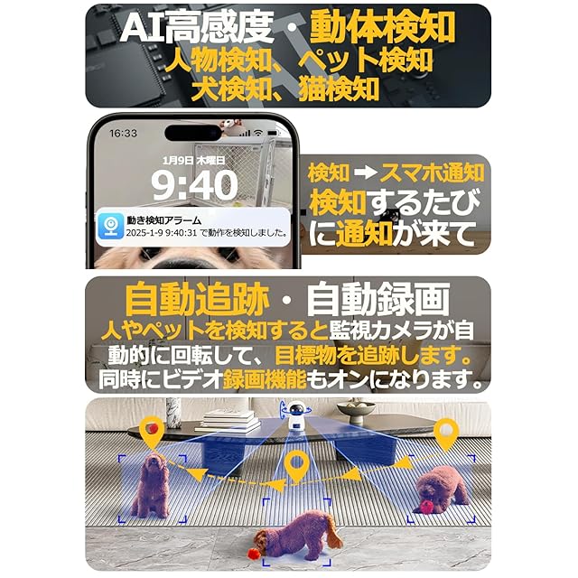 【動体検知・人物検知・ペット検知・自動追尾・スマホ通知・無料で使える】AI高感度センサー搭載、見守りカメラが人、ペット、を検知すると、自動的にスマホに通知。人やペットを検知した後、その動きが追跡され。ペットカメラ、見守りカメラ、室内 防犯カメラ、みまもり 留守番カメラ、介護カメラとしても使える。