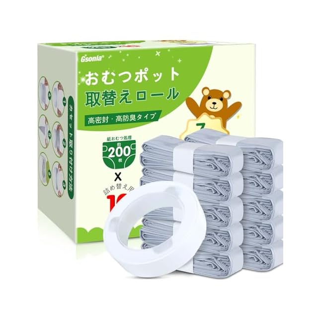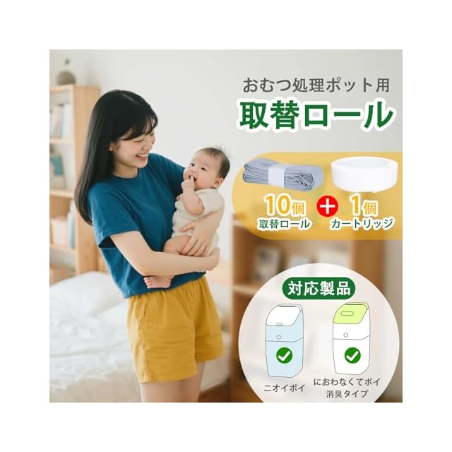 経済的:1パッケージにおむつゴミ箱用詰め替え袋10枚と空カートリッジ1個入り。 20%追加の長さ(1個は約1カ月分) ※赤ちゃん用紙おむつ1日6個の場合 約200枚分を処理できる。従来のプリロードカセットと比べてコスト削減、省スペース、ゴミ削減ができ、家計と環境にやさしい