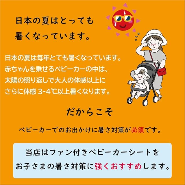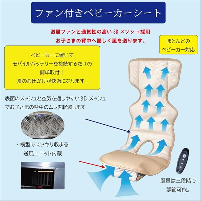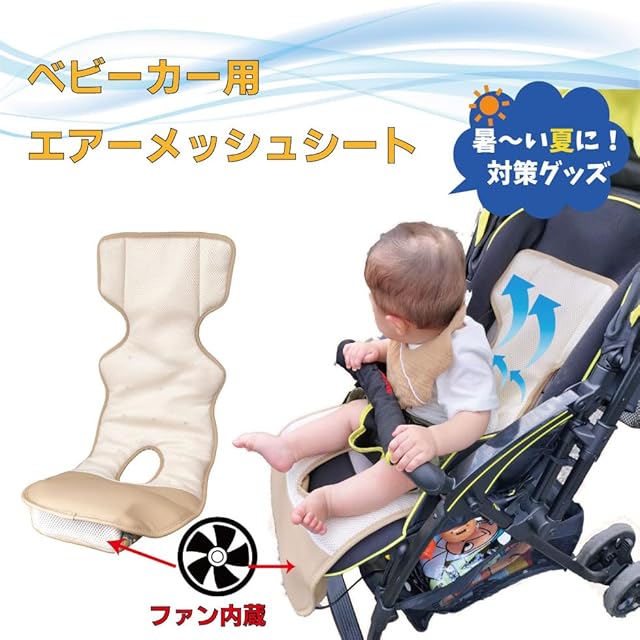 本製品の注意点(必ずご確認ください)<br>・本製品はリーズナブルな価格にするためパッケージ等をなくしております。製品を簡易的な袋に入れてお届けします。<br>・本製品は赤ちゃんの使用を想定しております。<br>大人が感じる何気ない風量も赤ちゃんにとってはとても強い風になります。そんな赤ちゃんを守るため、本製品は風が強く出ない仕様にしております。予めご了承ください。<br><br>ベビーカーやチャイルドシートに取り付ける扇風機内蔵のメッシュシートです。<br>暑い夏のベビーカーのお出かけを快適にします。<br><br><特徴><br>・ベビーカーに載せるだけの簡単取付<br>・シートから風を出して背中のムレを軽減します。<br>・幅広いベビーカーとチャイルドシートに対応している汎用タイプ<br>・風量は三段階に調節可能<br>・裏面は滑り止め加工済み<br>・USB給電なのでモバイルバッテリーを接続しておくことでどこでもご利用いただけます。<br>・つけたままベビーカーは折りたたみ可能です。<br><br>動作時間目安<br>モバイルバッテリー5000mAh使用時<br>強で連続作動時間約10時間<br>弱で連続作動時間約18時間<br><br>適合確認ベビーカー 23年7月現在<br>◆アップリカ(Aprica)<br>ラクーナ<br>ラクーナエアー<br>カルーンエアー<br>マジカルエアー<br>◆ピジョン<br>ランフィ<br>◆コンビ(combi)<br>スカルゴswitch<br>スカルゴαコンパクト<br>ラベリタ<br>◆サイベックス(CYBEX)<br>リベル<br>オルフェオ<br>◆Joie(ジョイー)<br>ライトトラックス4 <br><br>※ベビーカー対応と記載してますが目安です。<br>本シートを付けて腰のベルトが閉められたという点を基準にしております。取付をお約束するものではありません。<br>メーカーの仕様変更や使用環境によって結果が変わることがあります。<br><br>