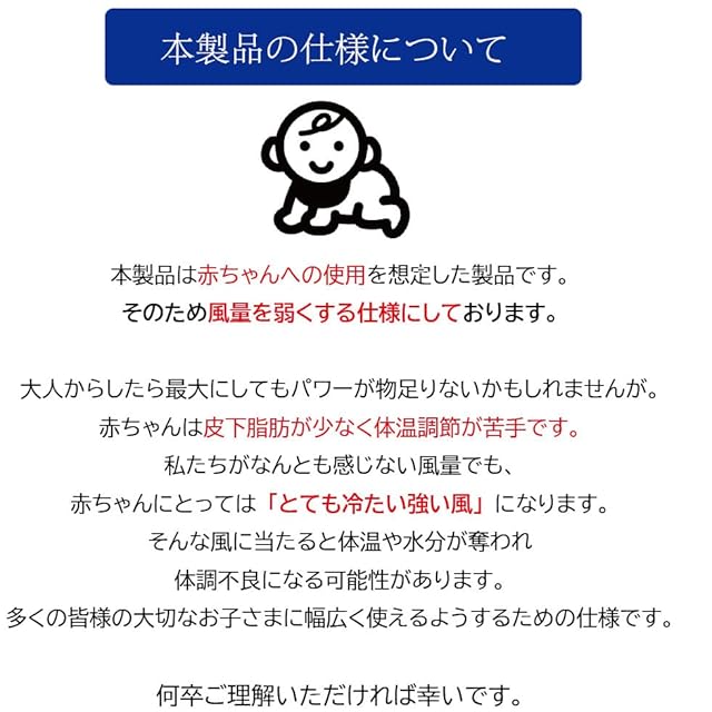 ※※本製品は赤ちゃんへの使用を想定しているため風量は敢えて弱くしております。 大人からしたらとても弱いと思いますが赤ちゃんに向けた仕様です。 予めご了承ください。