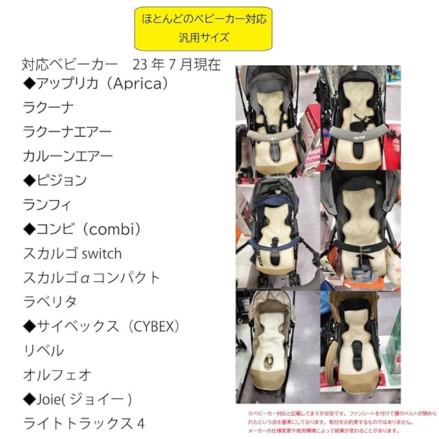 ※ベビーカー対応と記載してますが目安です。本シートを付けて腰のベルトが閉められたという点を基準にしております。取付をお約束するものではありません。メーカーの仕様変更や使用環境によって結果が変わることがあります。