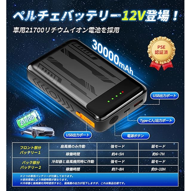 【合計60000mAh超大容量&21700高性能バッテリー&長時間連続稼動】安心と安全を第一に。コンパクトと高出力化を兼ね備えた20000mAh大容量バッテリーを搭載!電気自動車が採用するハイパフォーマンスの同型 21700 バッテリーを使用し、従来のバッテリーと比較して、寿命が3倍長く、5年以上の安心した使用が可能です、付属のバッテリーは日本電気安全法認証(PSE)を取得しました。2個30000mAh大容量バッテリーが搭載して、最大8時間の冷たさを持ちます。夏場は、電気技師、建設作業員、溶接機、工場、宅配便、コック、交通警察、農業、釣り、ゴルフ、ジョギング、ランニング、登山などのに適用。(ご注意:使用時間は目安です。着用条件・使用環境・充電回数によって異なります。)