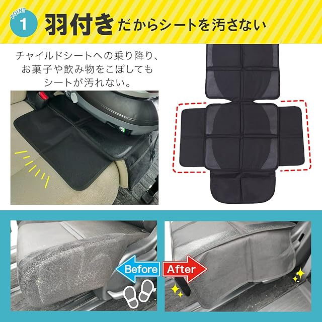 チャイルドシート保護マットです。 チャイルドシートの下に敷くことで車のシートを汚れや傷、凹みから保護することができます。 このチャイルドシート保護マットは座面の横側もガードするための「羽根」が付いたデザインです。他商品と比べて汚れをカバーする範囲が広いのが特徴です。