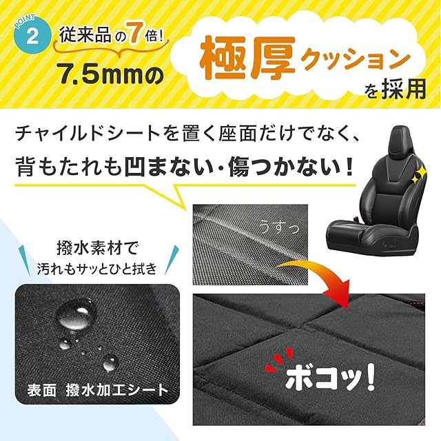 【極厚クッション生地】厚さ7.5ミリのクッション生地を採用。チャイルドシート、ジュニアシートによる凹みから愛車を守ります。車シートの座面だけでなく背もたれ部分も凹まない・傷つかない。裏地は滑り止め付き。