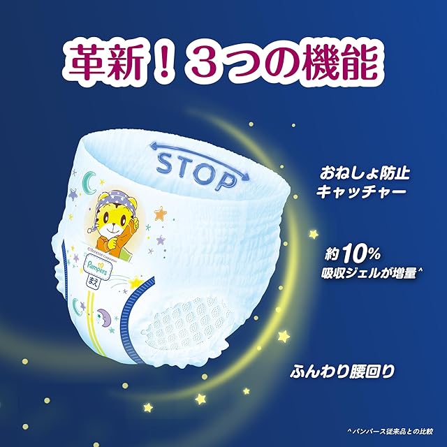 【パンパース おやすみパンツ おねしょ防止パッド新採用!】夜は昼の10倍モレやすい*。おねしょ防止パッドを搭載し、一晩中のおしっこを受け止めます。夜もモレ・ムレ安心。 * P&G調べ(Lサイズ, N=115)
