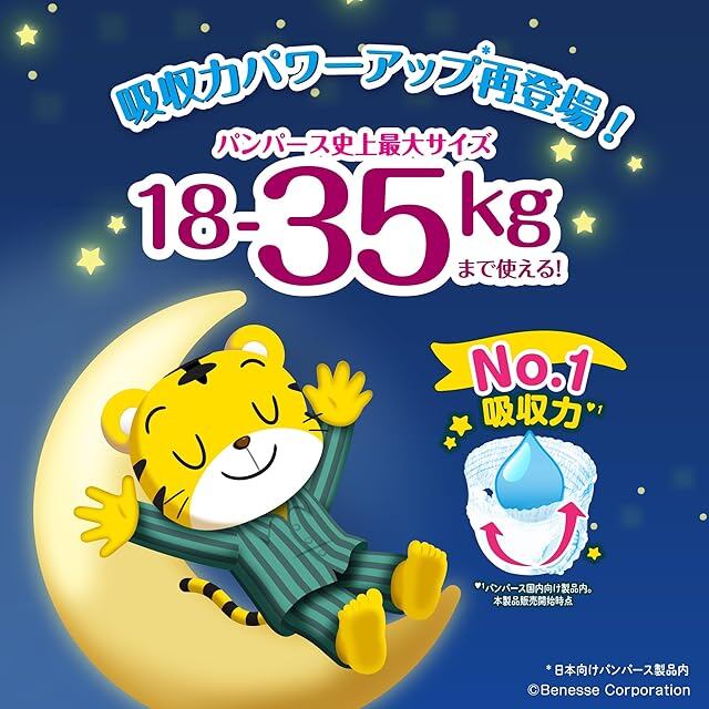【パンパース史上最大*サイズ】スーパービッグサイズは35kgまで使える。大きめのお子様や万が一の夜のモレ対策に!*パンパース国内製品内比較。本製品販売開始時点において。