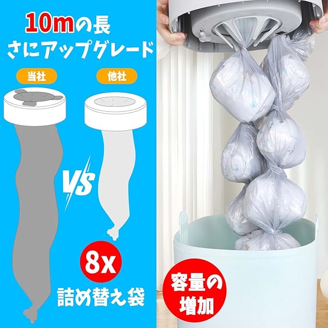 容量アップ: 10メートルにアップグレードされた長さで、従来よりも大容量のオムツ袋を提供します。リフィルや交換の頻度を減らし、使用時間を延ばすことができます。