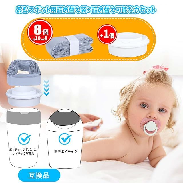 商品名:7層防臭 おむつゴミ箱用 詰め替え袋 10mx8個, 旧型ポイテック/ポイテックアドバンス/ポイテックW防臭 カートリッジ 対応互換(空カセット1個付き)