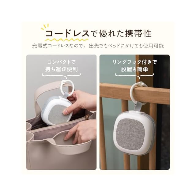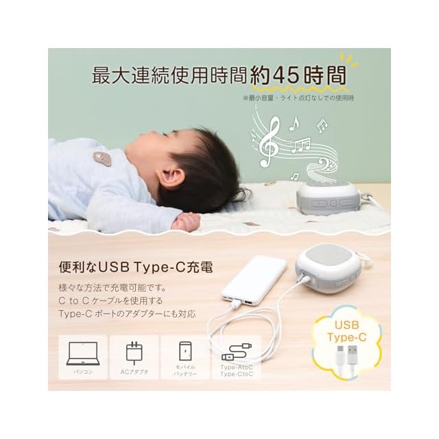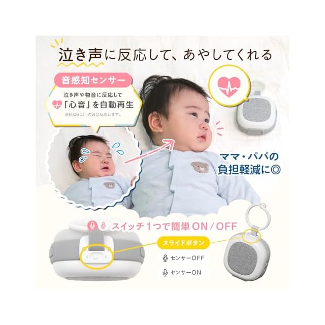 【音感知センサー】音感知センサーは、赤ちゃんの泣き声や60dB以上の振動を感知すると、自動的に胎内音を流す機能です。この機能をONにすると、赤ちゃんが泣き始めた際に手動で操作する必要がありません。センサー機能を使わない場合は、スライドボタンでOFFにできます。【タイプC充電式で持ち運びも便利】USB Type-Cで充電が可能で、外出先でも便利に使用できます。軽量、持ち運びに便利で、ベビーカーやベビーベッドに簡単に取り付けられるリングフックも付属しており、いつでもどこでも使用できます。