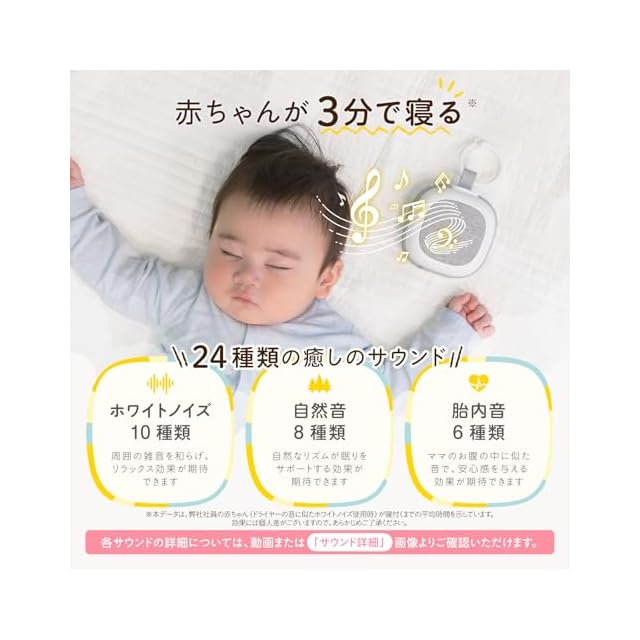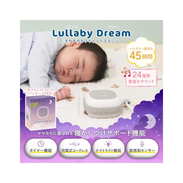 福岡県に本社を置くベルモンドの「ララバイドリーム」は、赤ちゃんの寝かしつけや快適な睡眠環境をサポートするホワイトノイズマシンです。赤ちゃんの睡眠を守るための24種類の音を収録し、出産祝いにもピッタリのアイテムです。【”赤ちゃんが好きな音”アンケートをもとに厳選した音】扇風機2種類、ドライヤー、掃除機、洗濯機、テレビの砂嵐2種類、セミの鳴き声、波音、ジャングル自然音、雷雨、カモメ、鳥のさえずり、川のせせらぎ、農場の音、胎内音(お腹の中の音)6種類、列車の走行音、高速扇風機、焚き火