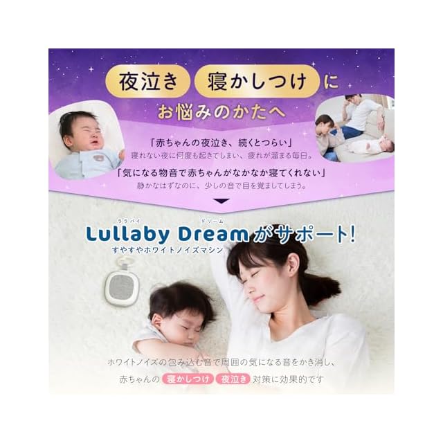 福岡県に本社を置くベルモンドの「ララバイドリーム」は、赤ちゃんの寝かしつけや快適な睡眠環境をサポートするホワイトノイズマシンです。赤ちゃんの睡眠を守るための24種類の音を収録し、出産祝いにもピッタリのアイテムです。【”赤ちゃんが好きな音”アンケートをもとに厳選した音】扇風機2種類、ドライヤー、掃除機、洗濯機、テレビの砂嵐2種類、セミの鳴き声、波音、ジャングル自然音、雷雨、カモメ、鳥のさえずり、川のせせらぎ、農場の音、胎内音(お腹の中の音)6種類、列車の走行音、高速扇風機、焚き火 【タイマー機能】タイマー機能により、30分、60分、90分の間で音の自動オフを設定できます。【ナイトライト】優しい電球色2色、そして楽しい7色のライトで、赤ちゃんの寝室を照らします。授乳やおむつ交換時にも便利です。7色のライトはレッド、ジャスミンイエロー、オリーブグリーン、グリーン、アクアブルー、ブルー、バイオレットの順に変化。イルミネーションサイクルに設定することも、単色のみで使用することも可能です。明るさは無段階で調整でき、ライトをOFFにしても使用できます。 【音感知センサー】音感知センサーは、赤ちゃんの泣き声や60dB以上の振動を感知すると、自動的に胎内音を流す機能です。この機能をONにすると、ママが赤ちゃんのすぐそばにいなくても、赤ちゃんの泣き声を感知して自動的に心音を流し、赤ちゃんに安心感を与えることができます。センサー機能を使わない場合は、スライドボタンでOFFにできます。【タイプC充電式で持ち運びも便利】USB Type-Cで充電が可能で、外出先でも便利に使用できます 【長時間使用可能なバッテリーで外出先でも安心】「ララバイドリーム」は、1200mAhのバッテリーを搭載し、最大で約45時間の連続使用が可能です。ホワイトノイズモードでは音量によって約10時間〜45時間まで使用可能。ライトモードでは明るさによって約6時間〜約35時間使用可能です。USB-C充電により、パソコンやモバイルバッテリーから簡単に充電できます。旅行やお出かけの際も、バッテリー切れを心配せずに安心してご利用いただけます。 【安全設計と安心の素材】赤ちゃんに安全なBPAフリーの無毒無害素材を使用しており、国際CE取得商品です。より安全にご使用いただくため、カドのない、全体が丸みを帯びたデザインを採用しています。【使用上の注意】大切な赤ちゃんのために、使用前に必ず付属の説明書記載の注意事項をお読みください。【セット内容】本体×1、リングフック、USB-A to Cケーブル(約1m)、取扱い説明書