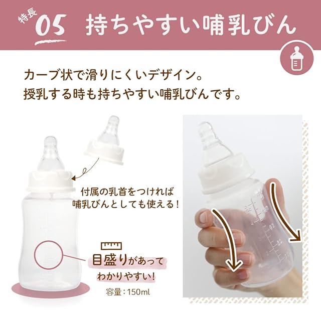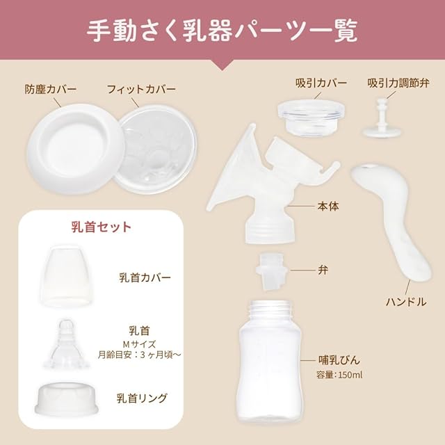 さく乳後そのまま授乳できるよう乳首セット付き。(乳首はMサイズ 3ヶ月頃〜)