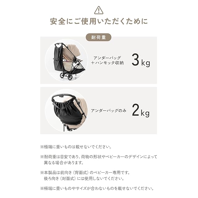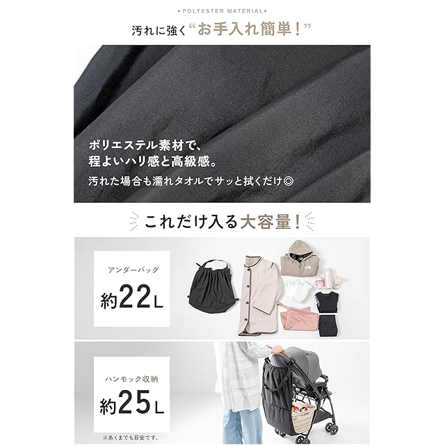 素材: ポリエステル(防汚・撥水加工) / サイズ: アンダーバッグ約22L・ハンモック収納約25L / 耐荷重: アンダーバッグのみ2kg・ハンモック収納時3kg / 対応ベビーカー: フレーム幅45cm以内・ベビーカーと車輪の間に10cm以上のスペース必要 / カラー: ブラック(シンプル&シックなデザインでどんなベビーカーにもマッチ)