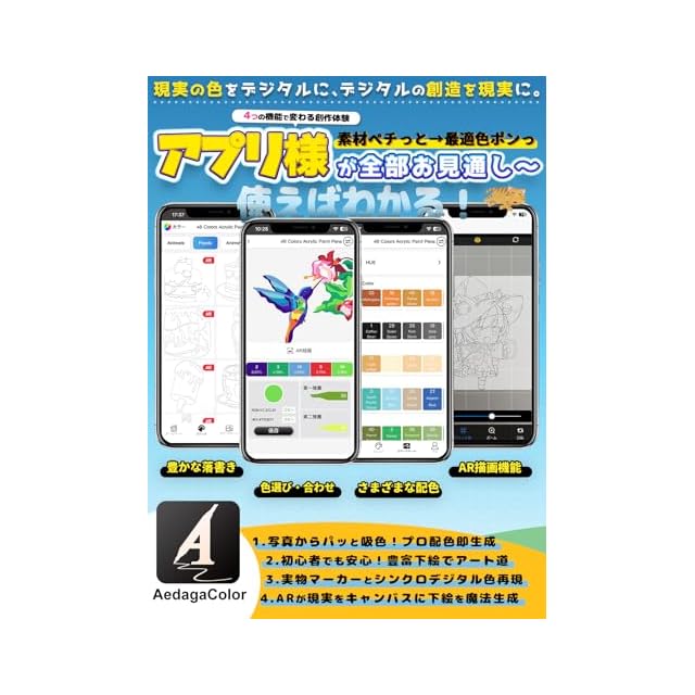 【色番号付きペン+APP】すべてのアクリルマーカーには色番号が付いており(数字順に並べられている)、APPが付属しており、APPは色を識別し、最も色に合った水彩ペンを推薦する機能を提供しており、ペンの色コードを通じて、必要なペンを容易に見つけることができる。アプリには芸術体験を高める機能がたくさんあります。