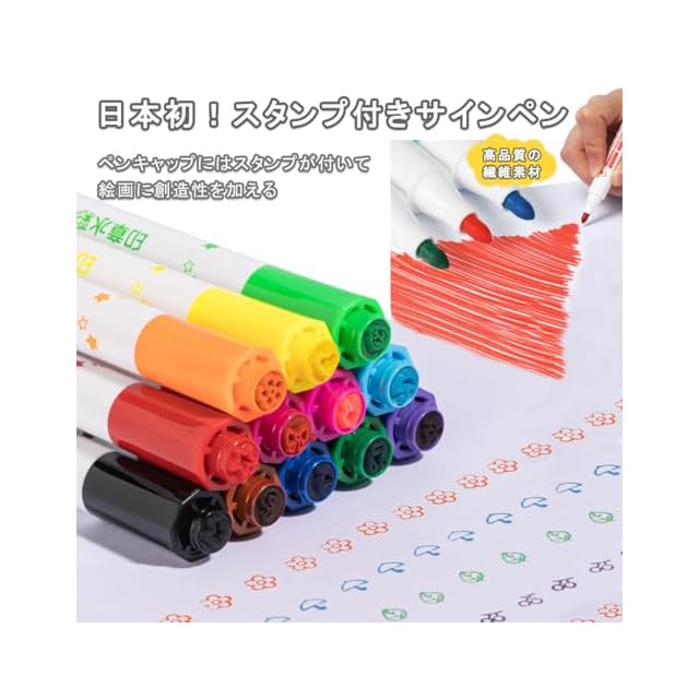 【楽しいインプリント水彩ペン】ペンのキャップには同じ色と異なる形のスタンプがあり、作成後に装飾を追加して、絵をより面白くするために装飾を加える!水性マーカーペンとして、肌や手についても水で洗い流すことができます、子どもが服を汚す心配はもうありません。※スタンプペンのキャップを取り外す際は、手の片側だけを使い、そっと上方に折るだけで簡単に開けることができます!