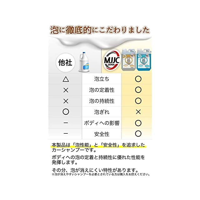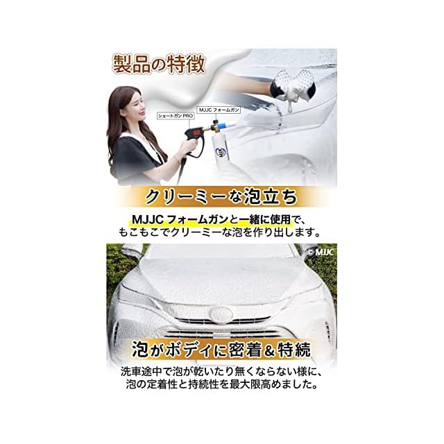 本製品はMJJCフォームガンのために開発された泡洗車用のシャンプーです。ボディへの泡の定着と持続性に優れた性能を発揮します。泡が消えにくい特性があります。(※泡が消えやすいシャンプーを必要とされている方の用途には向きません。)