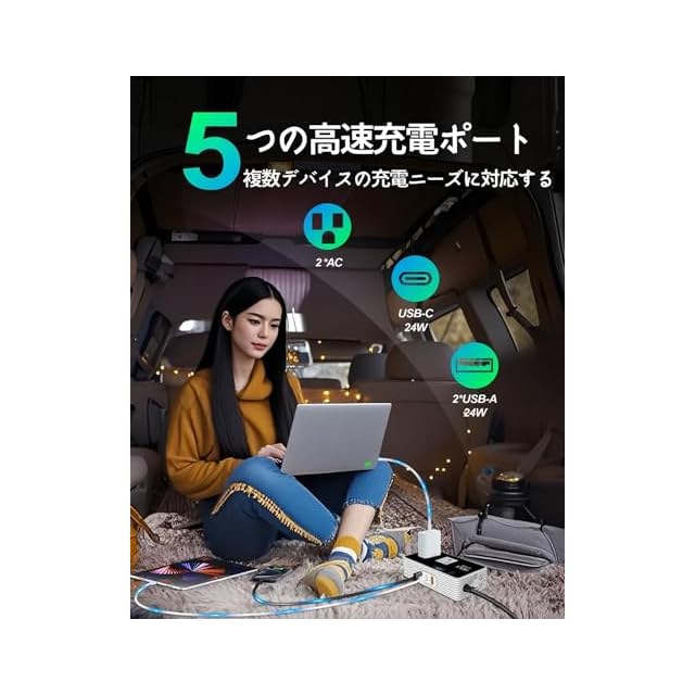 【車載パワーインバーター】車載パワーインバーターは、12V DC(直流)を110V AC(交流)に変換可能。2つの米国規格ACコンセントと4つのUSBポートを搭載し、ノートPC、ゲーム機、スマートフォン、タブレットなどの小型電子機器に最適。カー旅行、キャンプ、モバイルオフィスに必須の車載アイテムです。
