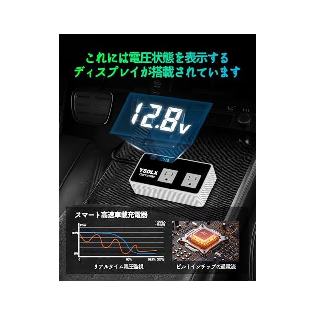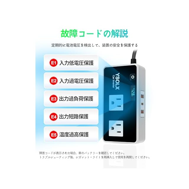 【多重保護機能】内蔵チップがインバーター・接続機器・車のバッテリーを保護。過電圧/過負荷/過熱/低電圧/短絡保護を搭載。赤ランプ点灯時は保護機構作動のため、安心してご利用ください。