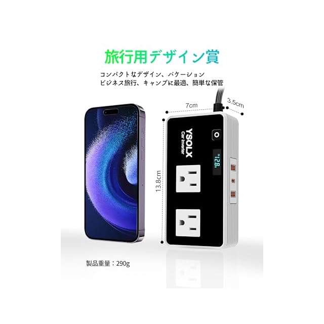 【コンパクト&高速充電】この車載充電アダプターはスマホサイズ(約13.7×6.9×3.6cm、重さ252g+)で、USB-QC(24W)、USB-C(24W)、110V ACコンセントを装備。電子機器の高速充電が可能で、旅行やキャンプ、仕事中の利便性を向上させます。