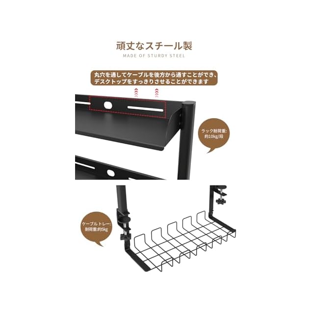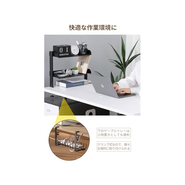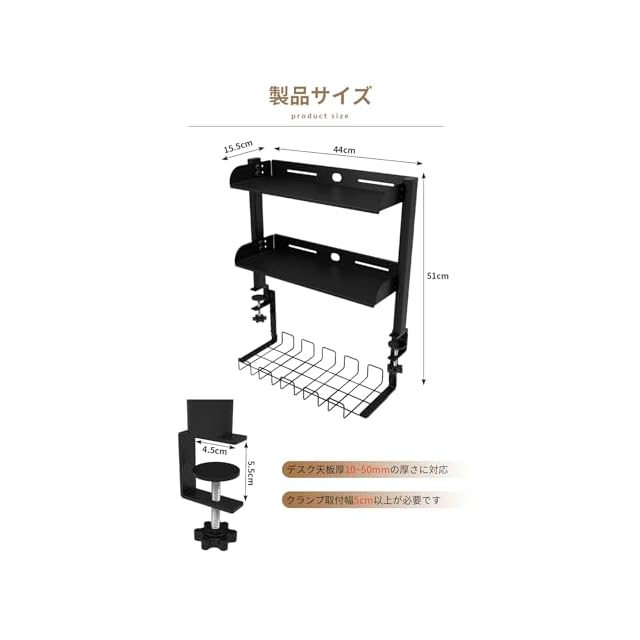 【製品】製品サイズ:ラック/幅44*深さ15.5*高さ33(cm)、ケーブルトレイ/幅42*深さ13*高さ19(cm)※組立方式や個体差により、サイズがマークと少し異なる場合があります。 クリップに緩衝材がついており、天板を壊さない。 何か問題があったら、できるだけ早く私たちに連絡してください。