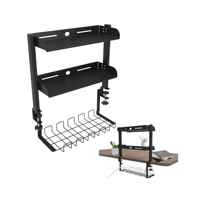 SAGVE(サゲビル) デスク上収納ラック 穴あけ不要 机上ラック ケーブルトレー付き クランプ固定 机上台 卓上棚 棚 可動棚 二段/三段 簡単組立 前後に調節できる 配線整理 デスク上 収納 ケーブルオーガナイザー付き (Black, 3階建ての棚:44*15.5*52cm) | つむぎ屋