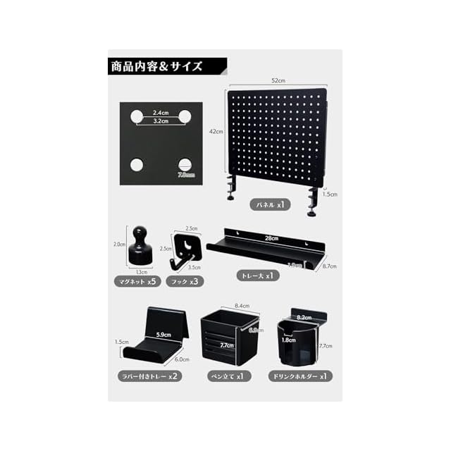 商品内容:・ペグボード×1・マグネット×5・フック×3・トレー大×1・ラバー付きトレー×2・ペン立て×1・ドリンクホルダー×1