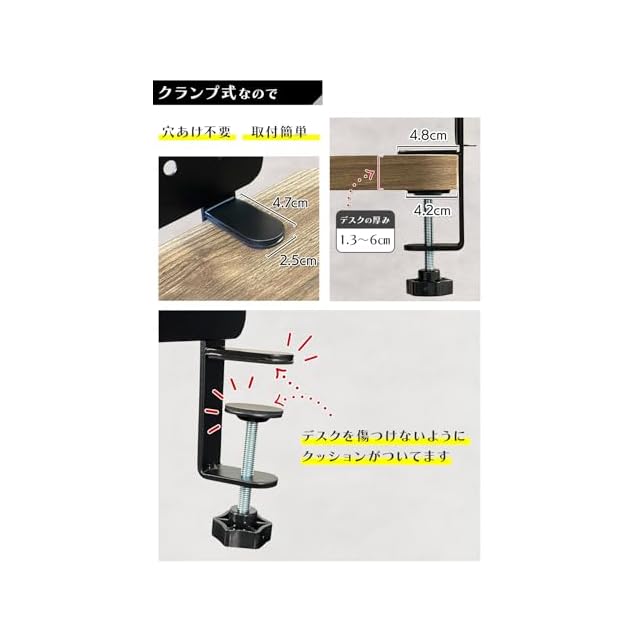 【デスクを傷つけない設計】クランプ式の為、デスクに穴をあける必要はありません。デスクに挟み込めばOKです。またデスクを傷つけないように、デスクを挟む箇所にはクッションがついてます。【対応デスクの厚み】・デスク上に取り付ける場合:0~7.5㎝、・デスク下に取り付ける場合:0~6.5㎝