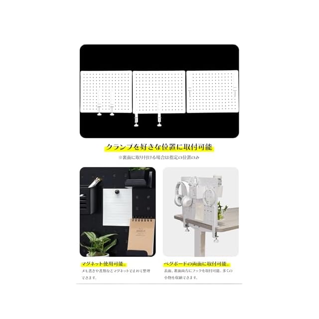 パーテーションとしても:ペグボードを複数枚連ねて取付ることによりパーテーションにもなります。※本製品にはペグボードは1枚しか含まれておりません。【配線整理としても】ペグボードをデスク下に取り付け、付属フックや付属トレーを活用することによりケーブルオーガナイザーとしても使用いただけます。