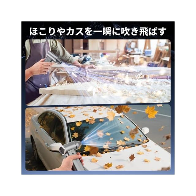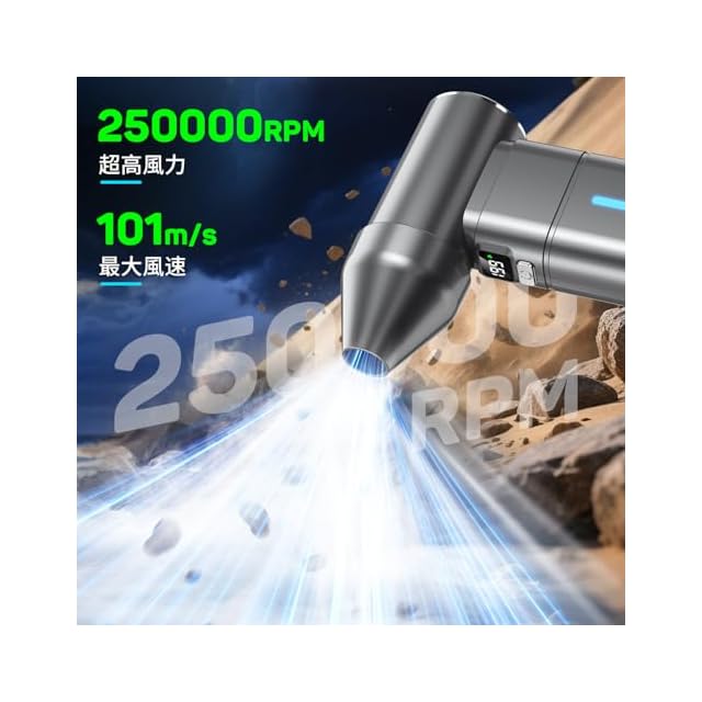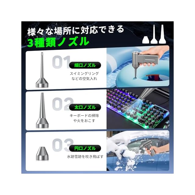 【高速回転&超強力噴射・3種類ノズル付き】 エアダスターは最新のブラシレスモーター技術を採用し、最大回転数250000RPM、最大風速101m/sを実現できます。製品と比較して圧倒的な風力を実現、強力な風量で、ぼこり・落ち葉・雪などを一瞬で吹き飛ばします。3種類のノズルを付属し、例えばエアコンの掃除・キーボードのホコリ・火をおこす・充気など、状況に合わせて適合なノズルを装着し、細かい場所でも簡単に使用OK!