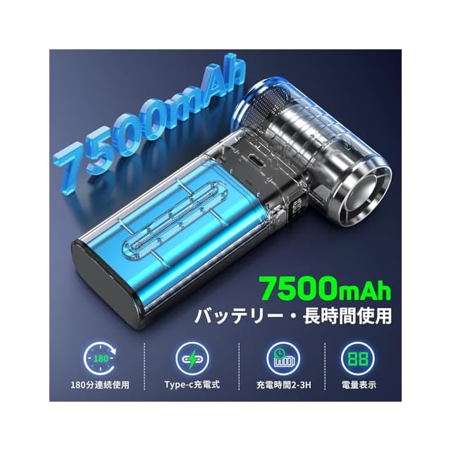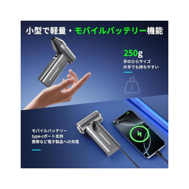【モバイルバッテリー機能・ディスプレイ表示】 2025年専門研究所に共同開発するエアダスターは他製品がない、独特なモバイルバッテリー機能を搭載します。エアダスターの7500mAhバッテリーは専用的なモバイルバッテリーに負けず充電速度で携帯などの電子製品をフル充電できます。しかもType-C端子でコンセント・パソコン・車載充電など様々な場所でエアダスターを急速充電します。また、エアダスターは液晶ディスプレイを装着します。使用中の風速モードと残っている電量を表示します。一目でわかる便利さは他製品に及ぶことができない。(注意❗❗モバイルバッテリーのポートはType-C口、出力電圧は5V2A)