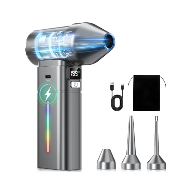 エアダスター ブロワー 強カ 洗車【2025年業界新技術・モバイルバッテリ一機能・金属外観】ディスプレイ&電量風量表示 省エネ対応 電動エアダスター 250000RPM高速回転 最大風速101m/s 5+1段階風量調整 7500mAh 180分連続使用 Type-c充電式 3モードLEDライト 3種類ノズル付き 250g 小型 洗車/車内/PC/キーボード/家具/掃除用等 説明書付き(grey) | つむぎ屋